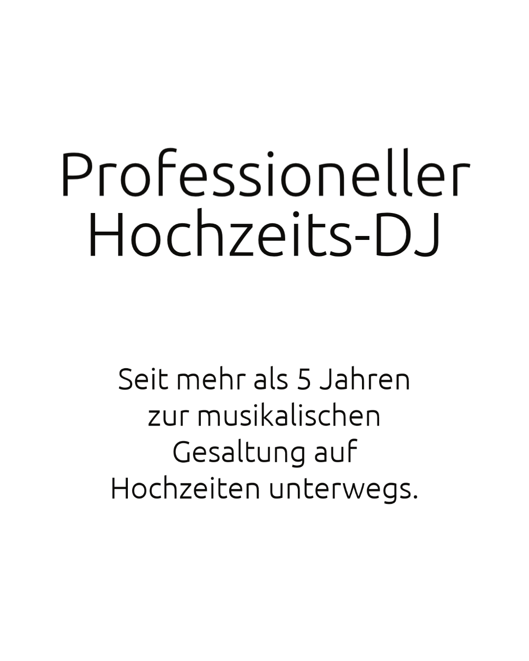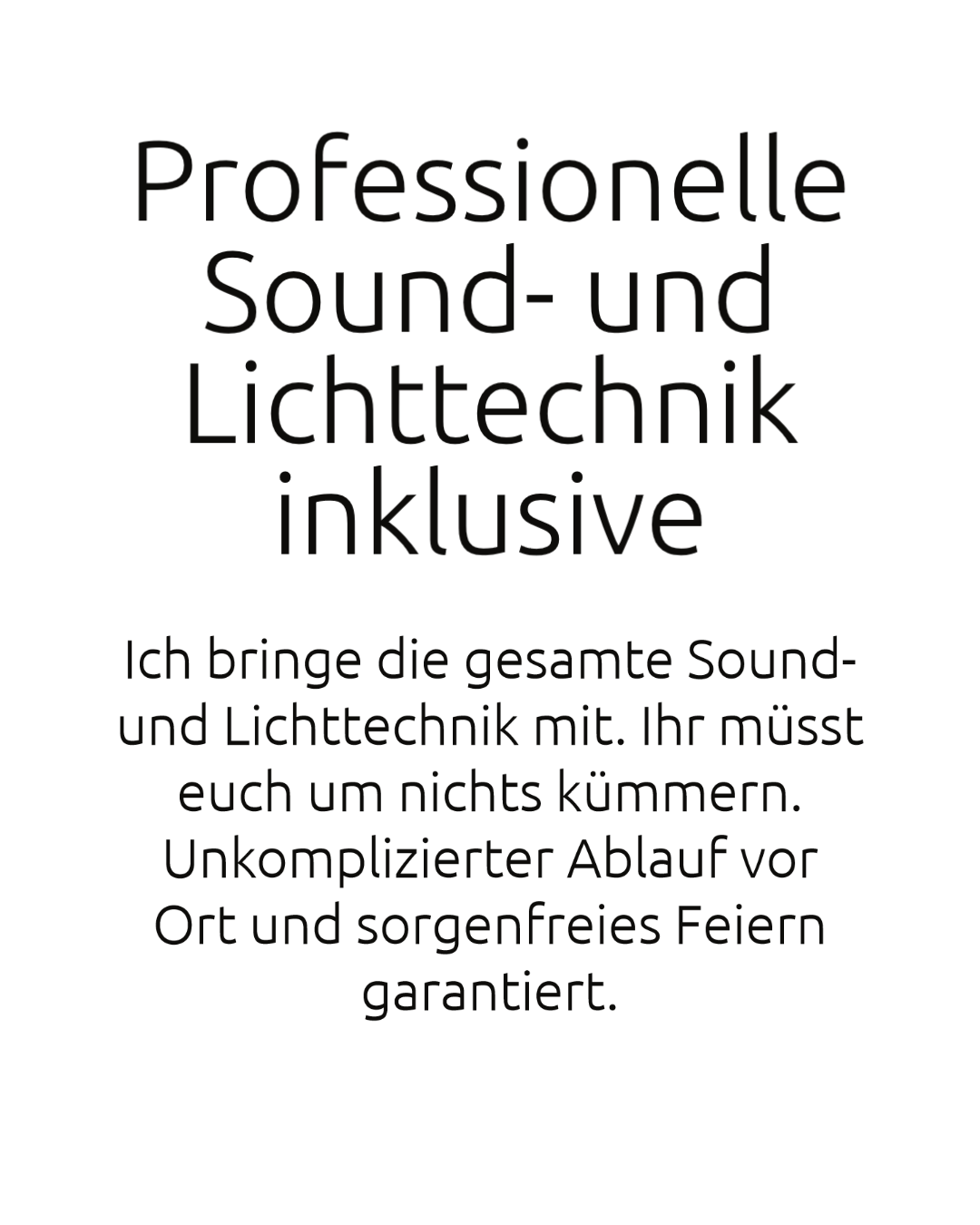 Mein Anspruch ist es an eurem Tag viele unvergessliche Momente mit euch zu schaffen und das Maximale aus eurer Feier herauszuholen. An eurem großen Tag müsst ihr euch um Musik, Stimmung und Technik keine Gedanken machen.